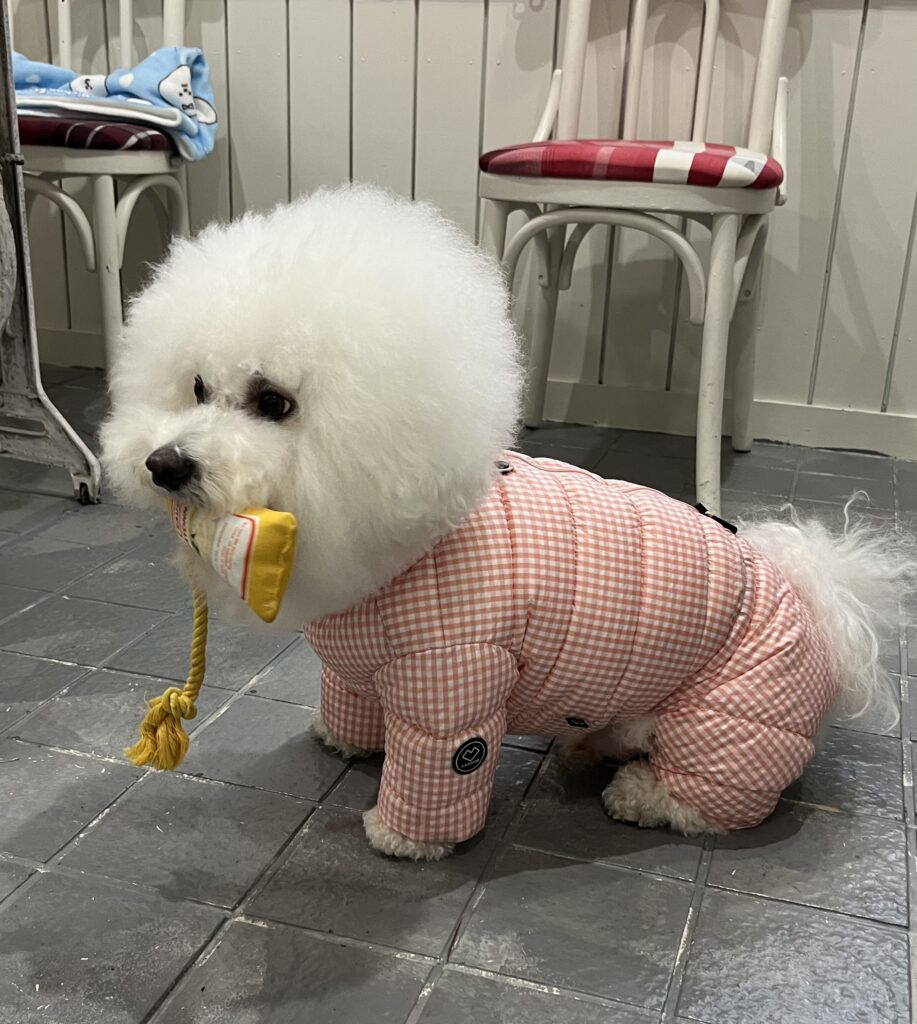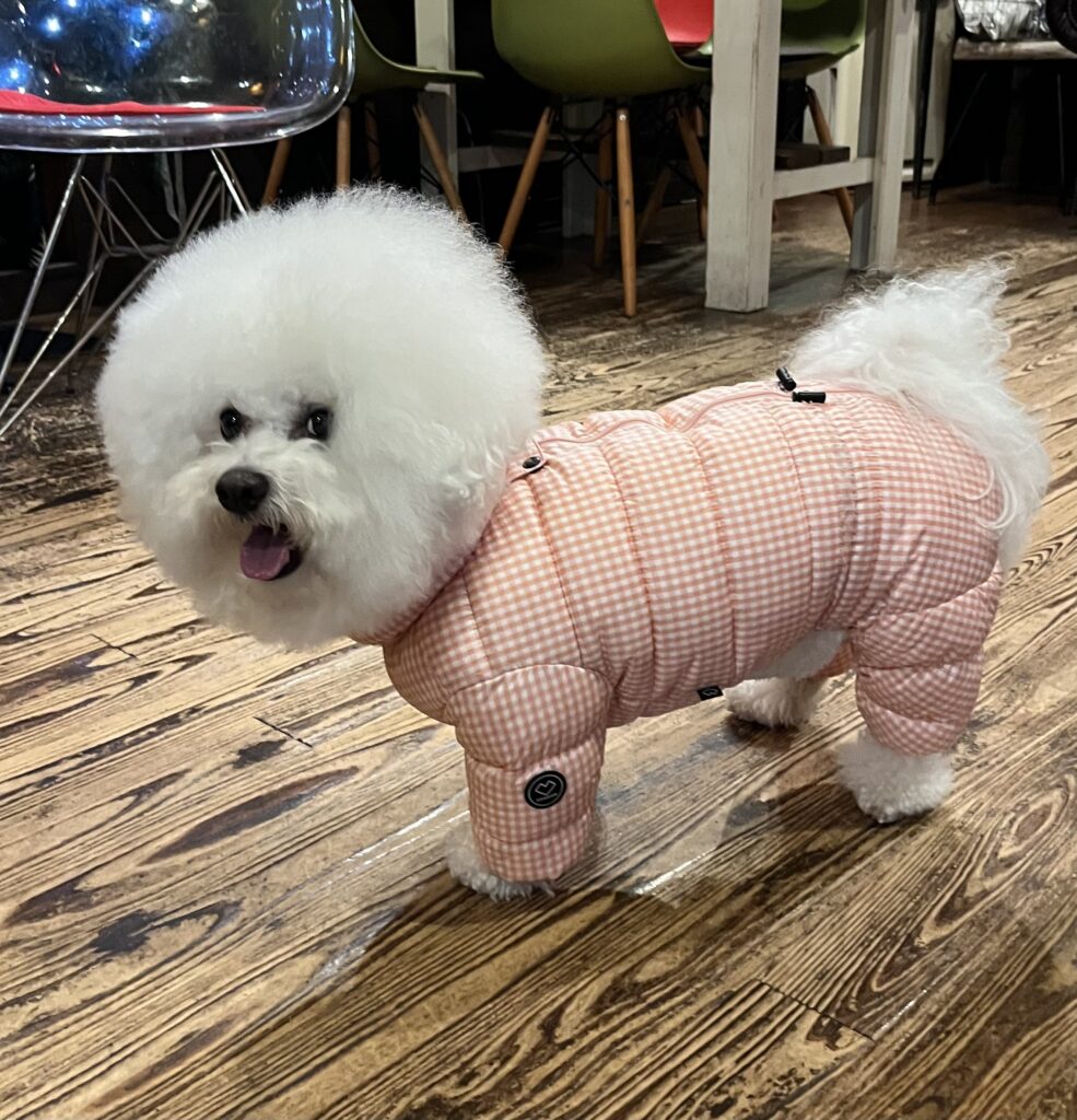 【犬服レビュー】ssoook(ソオオク)のチェックダウンが可愛すぎた|ビションフリーゼXXL着用